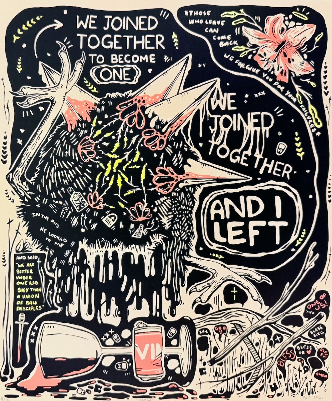 Ariana Pickard is a multidisciplinary artist currently living and working in Montreal, Quebec. She works with digital and traditional illustration, ceramics, fibres, and printmaking practices. A key aspect of her work is the heavy use of text, both with and without corresponding imagery. The intersection of art and words is fundamental to the function of her work, being to involve the viewer and allow them to reflect inward. The subject matter for said work revolves around universal experiences, sharing moments of connection, fear, grief, humour, nostalgia, and love.
